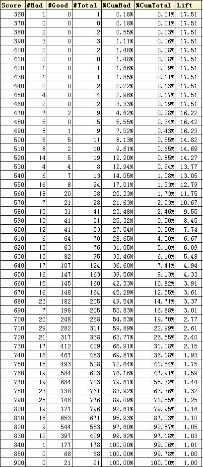 举个例子,一个贷款产品目标客群有10000个人,其中混合了500个坏客户。如果随机选择1000个人放款,可能会遇到50个坏客户。但是如果运用模型对坏客户加以预测,只选择模型分数最高的1000人放款,如果这1000个客户表现出来最终逾期的只有20户,说明模型在其中是起到作用的,此时的LIFT就是大于1的。如果表现出来逾期客户超过或等于50个,LIFT小于等于1,那么从效果上来看这个模型用了还不如不用。LIFT就是这样一个指标,可以衡量使用这个模型比随机选择对坏样本的预测能力提升了多少倍。