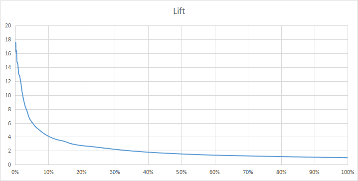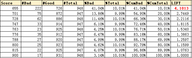 以上表为例,该模型的LIFT达到了4.1左右,是一个效果不错的模型。