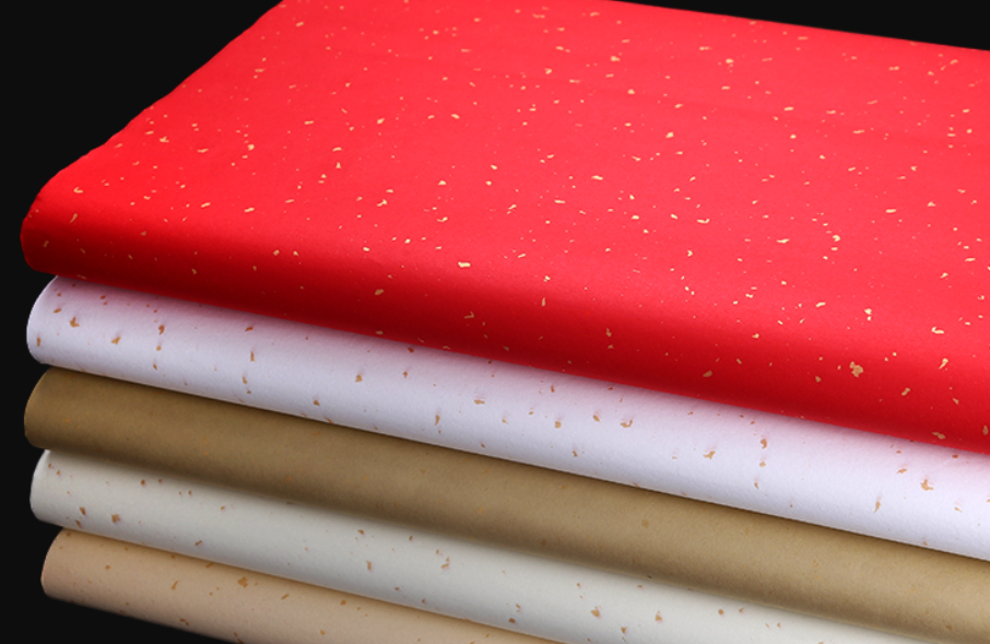一般是在宣纸的制造过程中,用金粉混合在胶中压在纸面上,最后会在彩色粉蜡纸面上呈现出金粉的光彩,也将这种纸称为“洒金笺”。