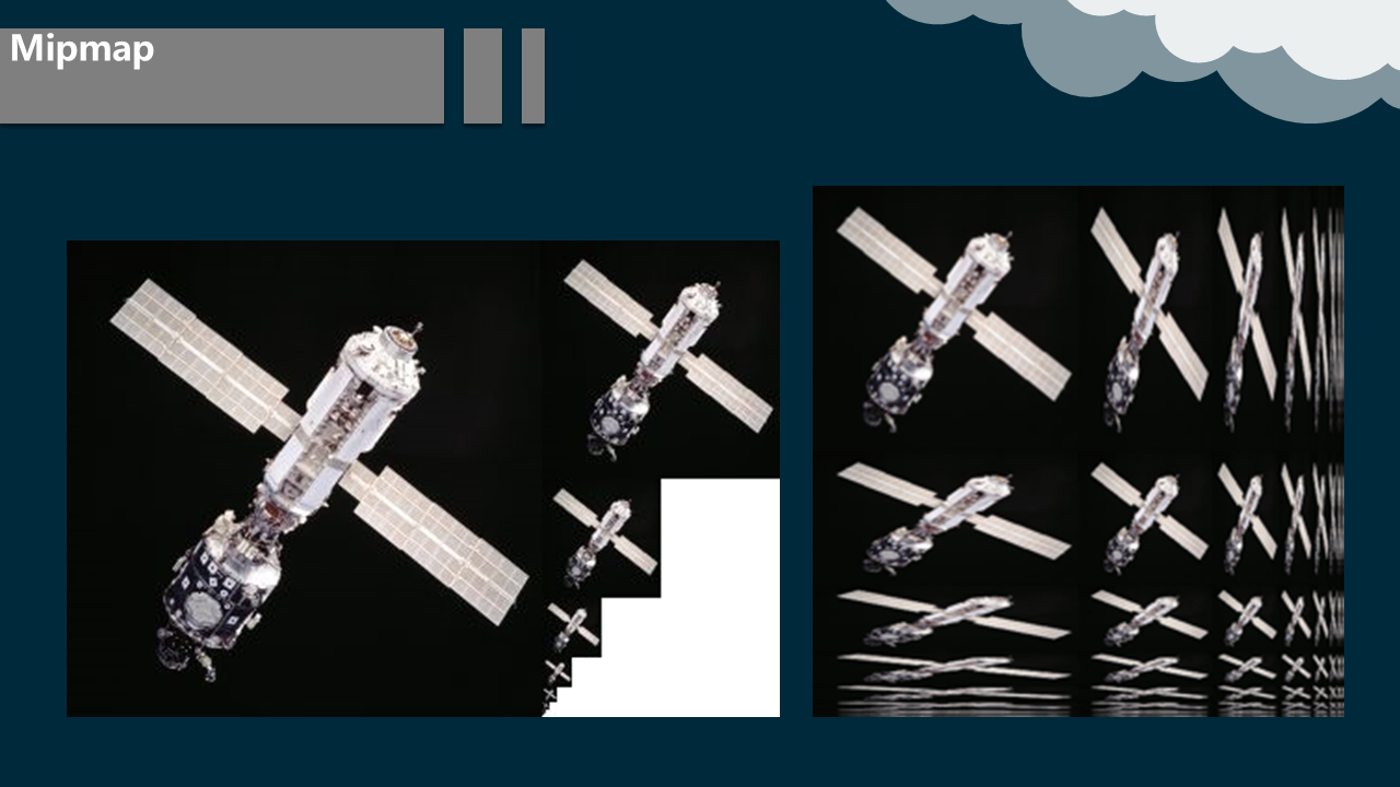 高分辨率的mipmap图象用于接近观察者的物体。当物体逐渐远离观察者时,使用低分辨率的图象。Mipmap可以提高场景渲染的质量,但是它的内存消耗却很大。