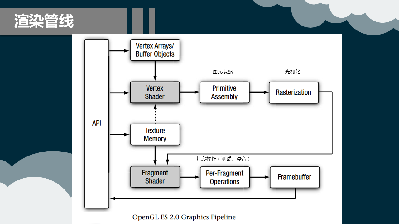 决定光和材质特效的操作称为着色。它包括了计算不同点的着色方程。典型的某些这类的计算运行在几何阶段的模型顶点数组上,另外一些则运行在逐象素的光珊化阶段。各类的材质数据,例如点所在位置,法向量,颜色或其它着色方程需用到的数值信息,可储存在每个顶点中。顶点着色的结果(这可能是颜色,向量,纹理坐标或其它种类的着色数据)会被送进光珊化阶段去插值。