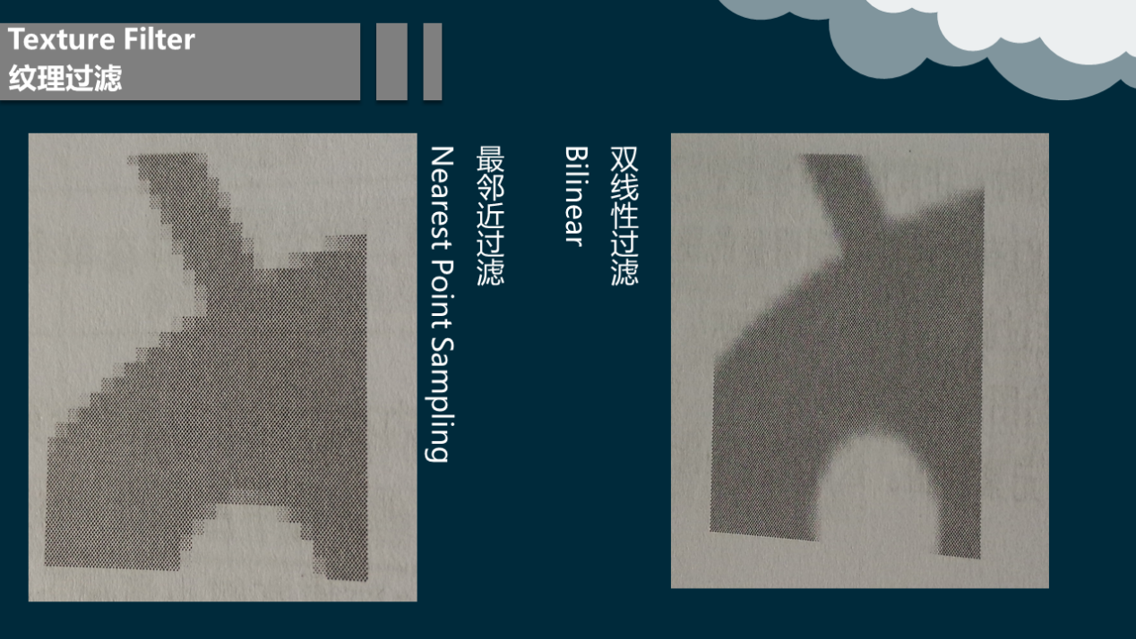 渲染一个图元时,会将三维图元映射到二维屏幕上。如果图元有纹理,就必须用纹理来产生图元的二维渲染图象上每个像素的颜色。对于图元在二维屏幕上图象的每个像素来说,都必须从纹理中获得一个颜色值。我们把这一过程称为纹理过滤(texture filtering)