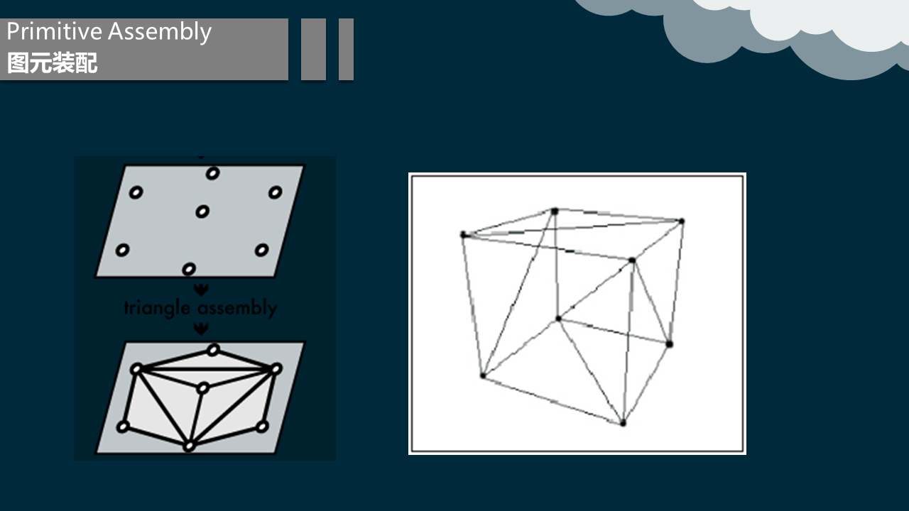 经过变换的顶点流按照顺序被送到下一个被称为图元装配的阶段。首先,在图元装配阶段根据伴随顶点序列的几何图元分类信息把顶点装配成几何图元。这将产生一序列的三角形、线段和点。这些图元需要经过裁剪到可视平截体(三维空间中一个可见的区域)和任何有效地应用程序指定的裁剪平面。