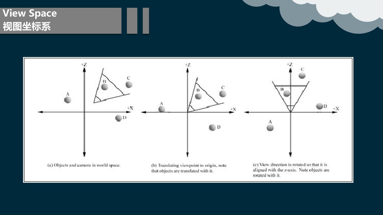 世界坐标系中的几何图与照相机是相对于世界坐标系而定义的,如图2.10所示。然而在世界坐标系中当照相机是任意放置和定向时,投影和其它一些操作会变得困难或低效。为了使事情变得更简单,我们将照相机平移变换到世界坐标系的源点并把它的方向旋转至朝向Z轴的正方向,当然,世界坐标系中的所有物体都将随着照相机的变换而做相同的变换。这个变换就叫做视图坐标系变换(view space transformation)。