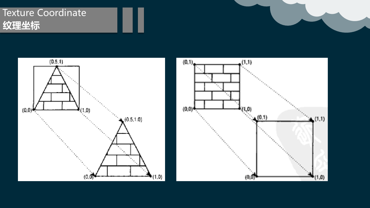 纹理坐标位于纹理空间中。也就是说,它们和纹理中的(0,0)位置相对应。当我们将一个纹理应用于一个图元时,它的纹理像素地址必须要映射到对象坐标系中。然后再被平移到屏幕坐标系或像素位置上。