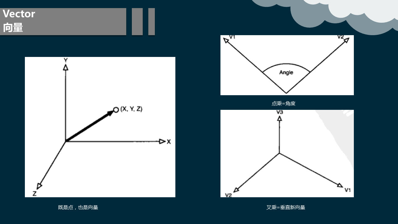 几何学中,我们用有向线段表示向量。向量的两个属性是他的长度和他的顶点所指的方向。因此,可以用向量来模拟既有大小又有方向的物理模型。例如,以后我们要实现的粒子系统。我们用向量来模拟粒子的速度和加速度。在3D计算机图形学中我们用向量不仅仅模拟方向。例如我们常常想知道光线的照射方向,以及在3D世界中的摄象机。向量为在3维空间中表示方向的提供了方便。