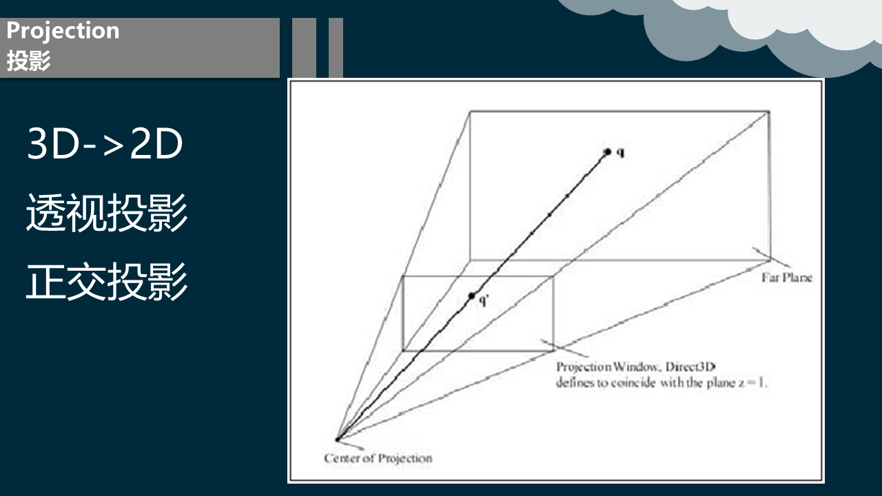 视图坐标系的主要任务就是将3D场景转化为2D图像表示。这种从n维转换成n-1维的过程就叫做投影。投影的方法有很多种,但是我们只对一种特殊的投影感兴趣,那就是透视投影。因为透视投影可以使离照相机越远的物体投影到屏幕上后就越小,这可以使我们把3D场景更真实的转化为2D图像。