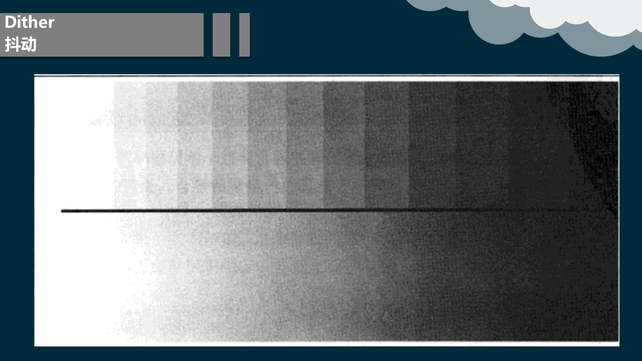 对于可用颜色较少的系统,可以以牺牲分辨率为代价,通过颜色值的抖动来增加可用颜色数量。抖动操作是和硬件相关的,允许程序员所做的操作就只有打开或关闭抖动操作。实际上,若机器的分辨率已经相当高,激活抖动操作根本就没有任何意义。默认情况下,抖动是激活的。