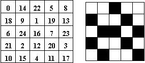 上图,左边为标准图案,右边为灰度为15的图案,共有10个黑点,15个白点。其实道理很简单,灰度为0时全是黑点,灰度每增加1,减少一个黑点。要注意的是,5×5的图案可以表示26种灰度,当灰度是25才是全白点,而不是灰度为24时。