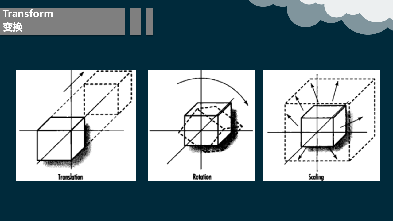 3D空间中最常用的变换主要是,平移,旋转,缩放
