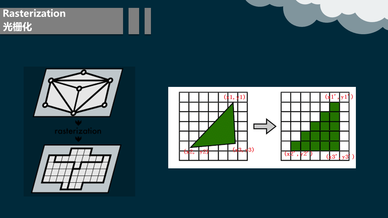 得到已变换及投影后的顶点及与之相关联的着色数据,光珊阶段的目标是计算并设置像素的颜色。这个过程叫光珊化或扫描变换,即从二维顶点所处的屏幕空间(所有顶点都包含Z值即深度值,及各种与相关的着色信息)到屏幕上的像素的转换。