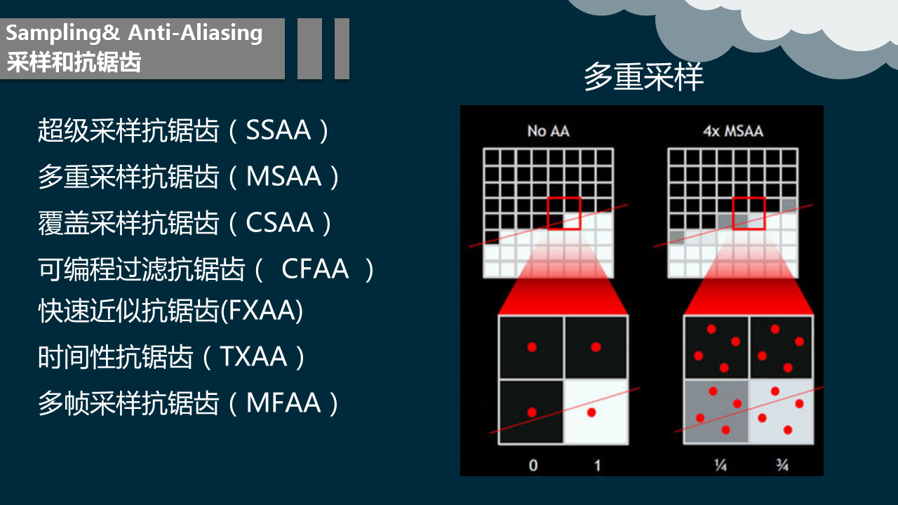 多重采样抗锯齿(MultiSampling Anti-Aliasing,简称MSAA)是一种特殊的超级采样抗锯齿(SSAA)。MSAA首先来自于OpenGL。具体是MSAA只对Z缓存(Z-Buffer)和模板缓存(Stencil Buffer)中的数据进行超级采样抗锯齿的处理。可以简单理解为只对多边形的边缘进行抗锯齿处理。这样的话,相比SSAA对画面中所有数据进行处理,MSAA对资源的消耗需求大大减弱,不过在画质上可能稍有不如SSAA。