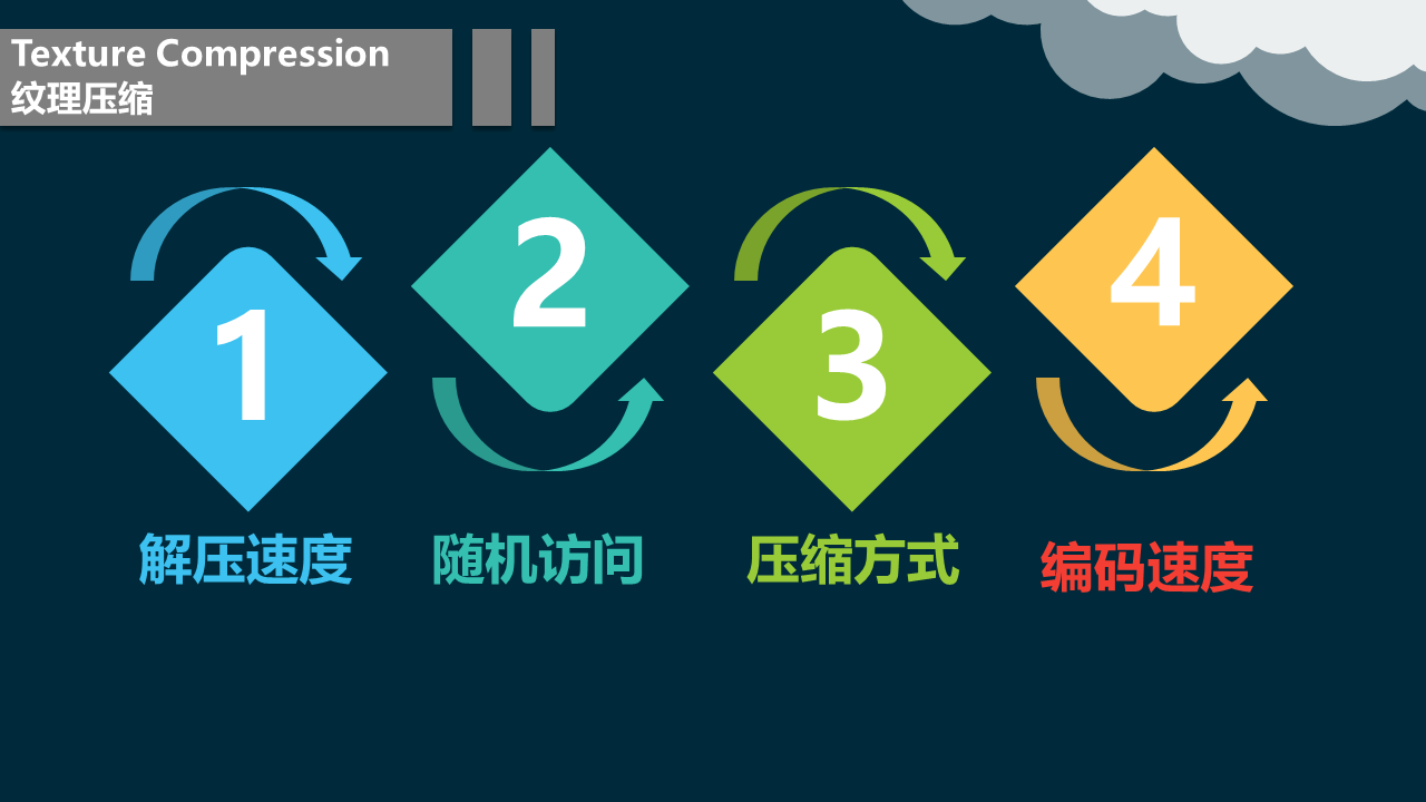 编码速度:纹理压缩对压缩速度要求不高,因为绝大多数情况下,纹理只需要进行一次压缩。