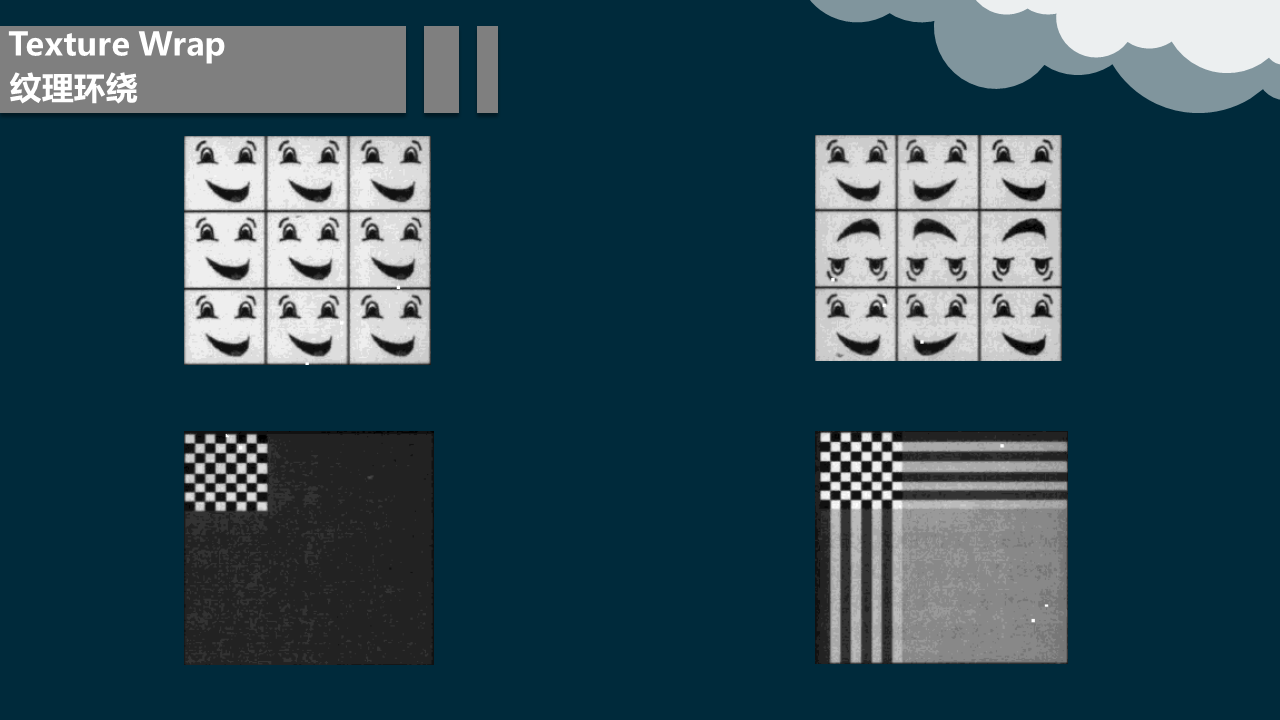 图象在表面上重复出现。忽略纹理坐标的整数部分,并将纹理图的拷贝粘贴在物体表面上,这样才能做到无缝连接。