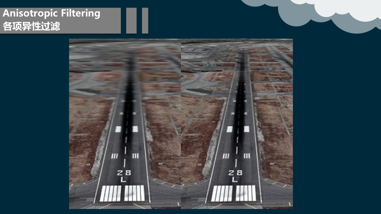 各向异性是对一个三维物体纹理像素的可见的变形,这个物体的表面朝向屏幕平面,并与之有一定的角度。各向异性图元的像素在映射到纹理像素时,它的形状会发生变形。