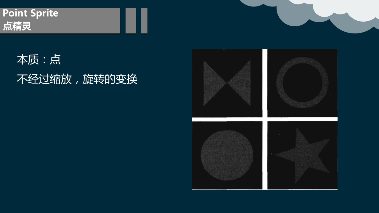 openGL的图形由顶点构成,以后利用顶点进行纹理的映射。点精灵就是,一个顶点被当作一个精灵来处理。特别之处就是,一个顶点也可进行纹理贴出。例如,原来是个顶点构成的一个矩形,现在一个顶点就可以完成了。瞬间我们就可以想想,粒子效果,那些云雾水流火花什么的用了点精灵,就可以瞬间减少3个顶点的计算,glDrawArrays使用GL_POINT就可以了,完全也不需要什么顶点索引了。这是非常诱人的效率。