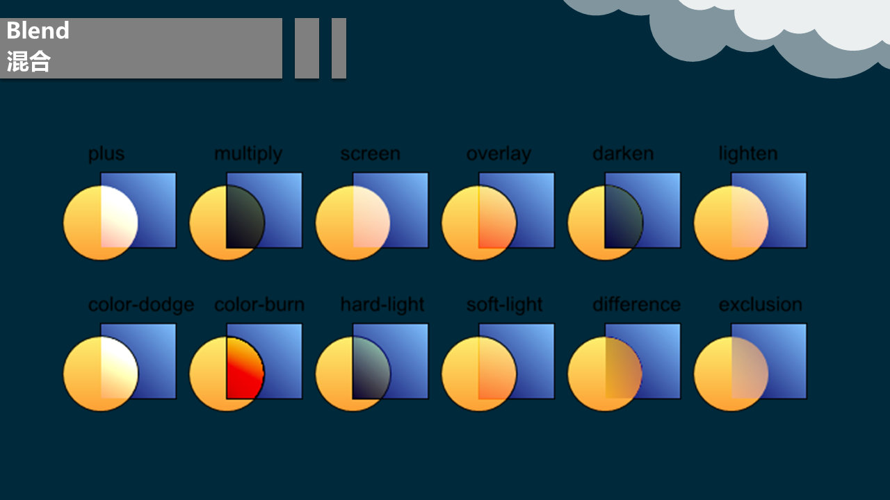 “混合”是指两种颜色的叠加方式。在新图片将要渲染画到屏幕上的时候,将用在新图片中的红、绿、蓝和透明度信息,与屏幕上已经存在的图片颜色信息相融合。
