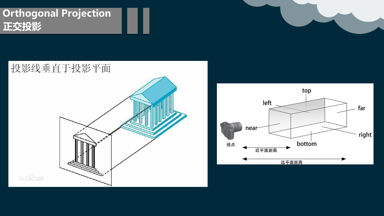 透视投影符合人们心理习惯,即离视点近的物体大,离视点远的物体小,远到极点即为消失,成为灭点。它的视景体类似于一个顶部和底部都被切除掉的棱椎,也就是棱台。这个投影通常用于动画、视觉仿真以及其它许多具有真实性反映的方面。
