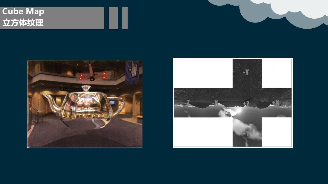 立方体纹理是一种特殊的纹理技术,它用6幅二维纹理图像构成一个以原点为中心的纹理立方体。对于每个片段,纹理坐标(s, t, r)被当作方向向量看待,每个纹素(texel)都表示从原点所看到的纹理立方体上的图像。