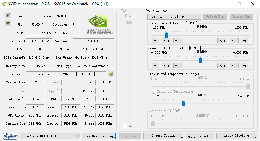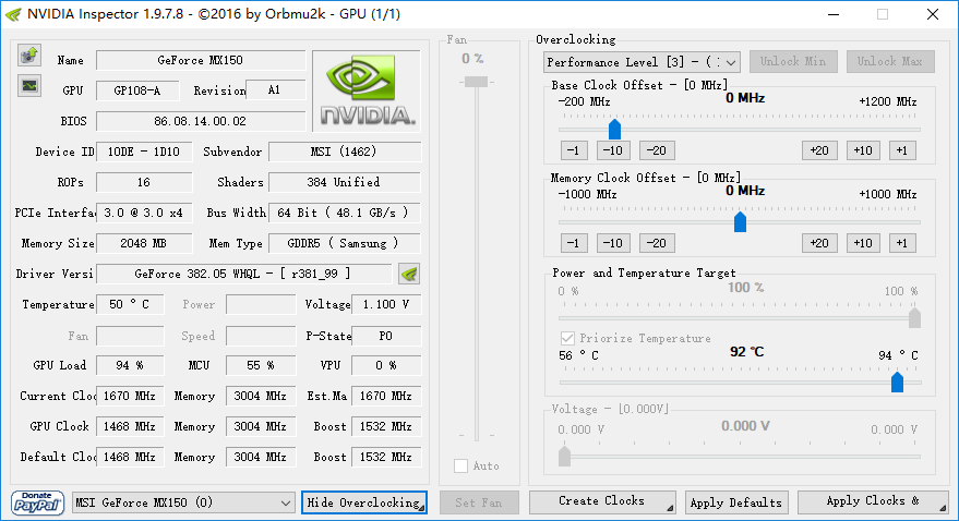 nvidiaInspector截图,标准版MX150是解锁软超范围的,温度墙最大94度,如果机器散热足够,可以考虑自己超频增强性能。