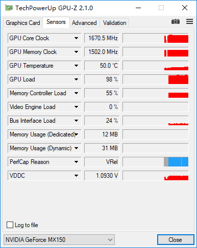 使用GPUZ自带的小渲染进行负载,实际显卡最大频率为1670.5MHz,核心电压达到了1.093V。最大频率跟显卡体质非常相关,这是之前微星PL62的测试机,后来我们还拿到了另外一台机器,同样的渲染,频率更高: