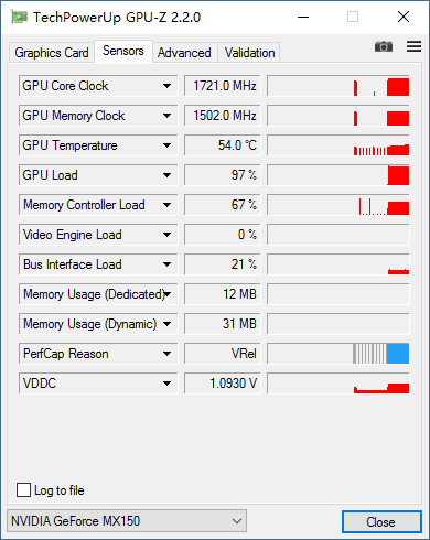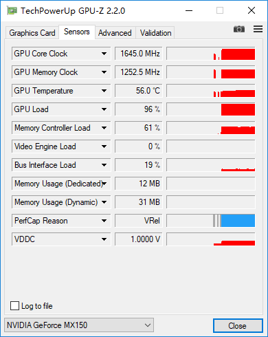 这说明低功耗版的MX150在电压上确实有了一定的优化,标准版在接近的频率下高出了将近0.1V的电压,发热自然也就有很大的不同。