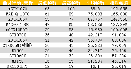 当然不是所有游戏都有这么大的幅度,新出的幽灵行动和质量效应中,低特效下标准版和低功耗版差异很小,同时标准版MX150也没有异常发挥,说明新游戏对这些显卡有较好的优化。
