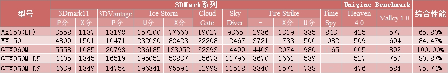 和其他显卡比较一下,标准版MX150比GTX950M D3高了10%以上,比GTX950M D5好了约4%,不如GTX960M的表现。低功耗版MX150比940MX好了约35%,比核显Iris550高了57%。