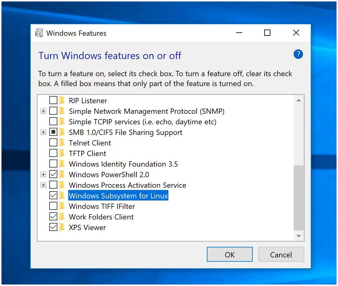 一旦您的系统重启,返回 “启用或关闭 Windows 功能” 页面,确认 “适用于 Linux 的 Windows 子系统” 已经被勾选。