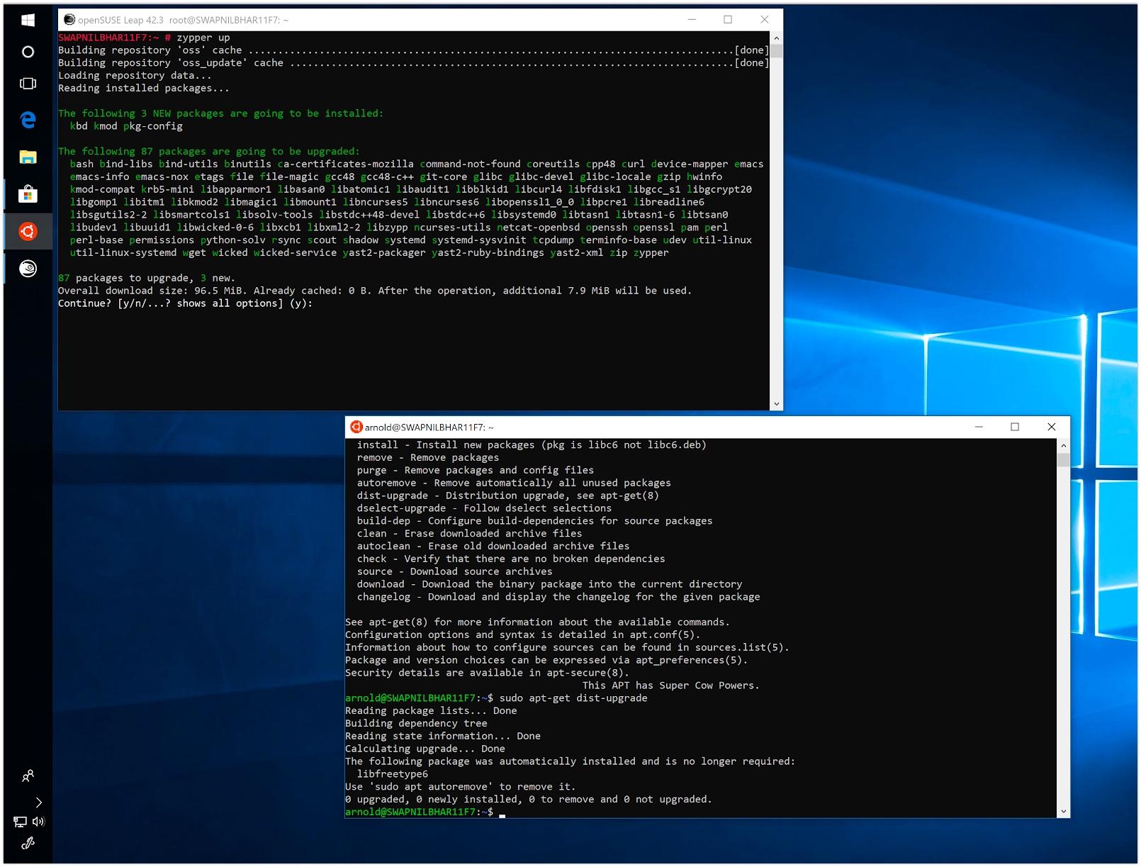 当您启动该发行版,它将会打开一个 Bash Shell 并且安装此发行版。安装完毕之后,您就可以开始使用了。您需要留意,openSUSE 中并没有(普通)用户,它直接运行在 root 用户下,但是 Ubuntu 会询问您是否创建用户。在 Ubuntu,您可以以 sudo 用户执行管理任务。