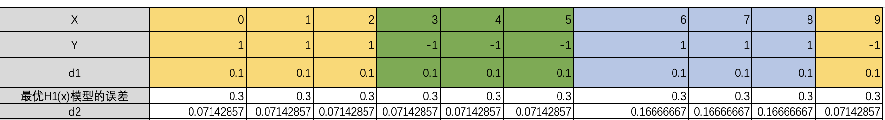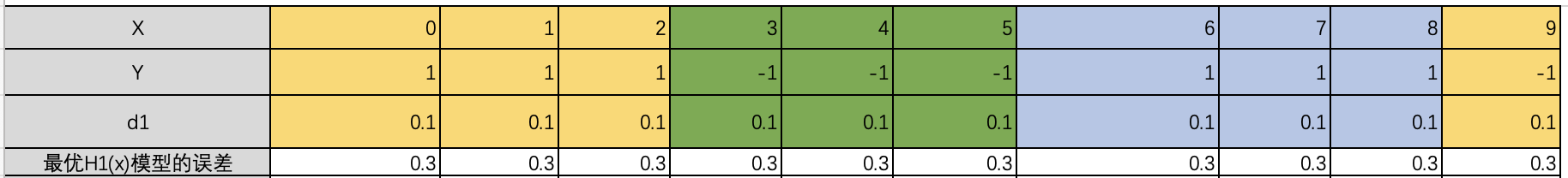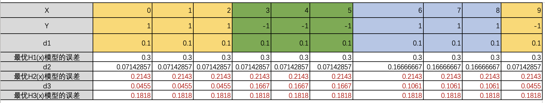 第二步,基于初始的样本权重d1(1/N=1/10)来计算出误差最小的模型,记住模型的误差等于误判X样本值的权重值和。H1(x)误判了6,7,8对应的误差值=0.3;H2(x)误判了0,1,2,9对应的误差值=0.4;H3(x)误判了3,4,5对应的误差值=0.3; 确定最有模型为H1(x)。