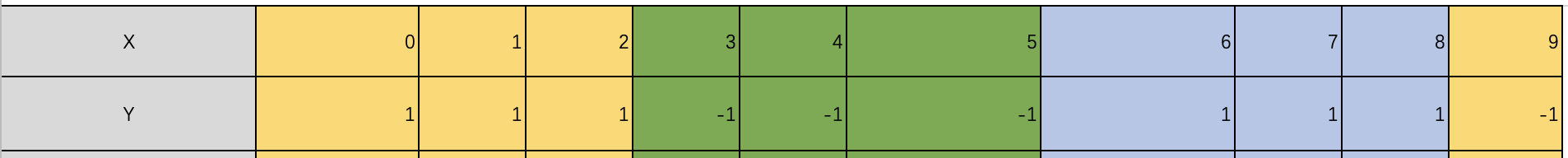 例如:根据X值判别Y值的二分类数据表: