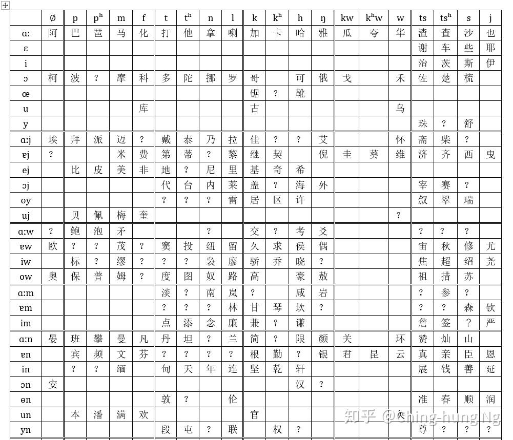 通过这张音节表,我们已经可以大致判断出此后填译音表时在映射关系处理上的一些需要注意的点: