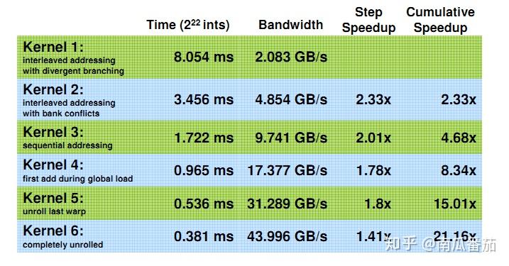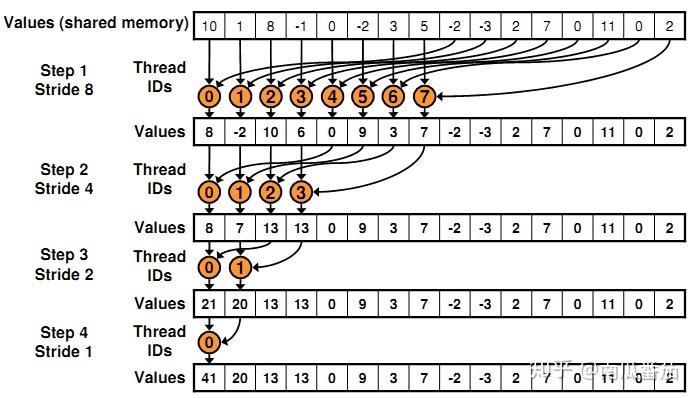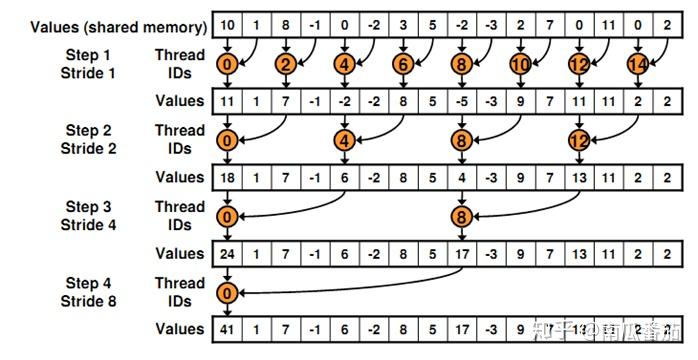 和之前举的 [1, 2, 3, 4] 的例子有些不同,这个例子每个线程取的两个数据之间的stride是前一组结果的一半。由于结合律我们知道,最终输出的数值是没差的,但是由于gpu硬件和cuda的设计原因,在最终代码实现的时候,这二者的执行效率还是有很大区别。