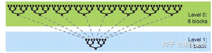 那么就有一个问题,由于每个线程块是对部分数据进行reduce,那么其输出结果如何通信,cuda没有global synchronization,咋办?kernel递归,如下图: