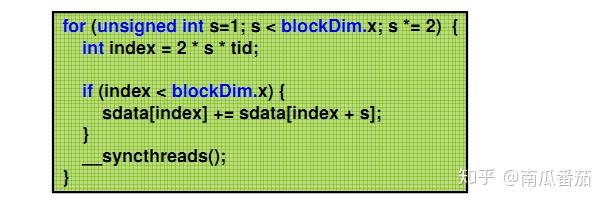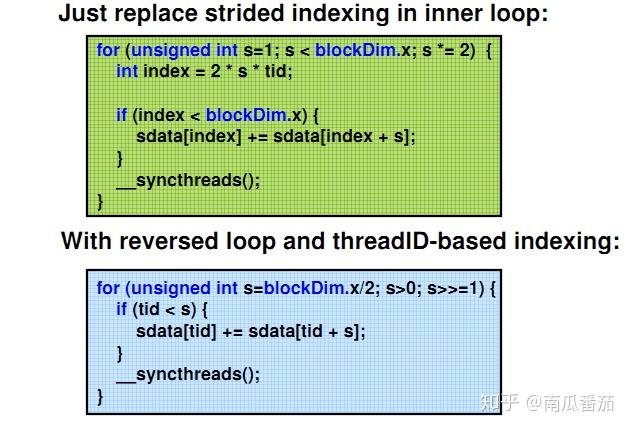 小标题没有错哈,仍然是Interleaved Addressing,只不过在 Reduction #1 基础上为了解决 highly divergent branching 问题作了些修改,把原来的for循环改成: