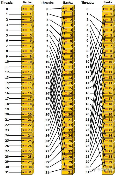 简单来说,bank conflict 指的是当同一个warp里的多个线程对同一个bank发出访问请求,只能进行串行访问,极大影响了并行效率。当bank conflict发生时,硬件将该访问请求拆分成多个conflict-free的请求,拆分出来的个数n,就说这个访问请求会引起 n-way bank conflicts。随后cuda引入broadcast机制,使得对同一个bank的同一个地址进行访问时,不会产生bank conflict, 一定程度上缓解了bank conflict,但对同一个bank里的不同地址进行访问时,bank conflict 问题仍然存在。举个例子: