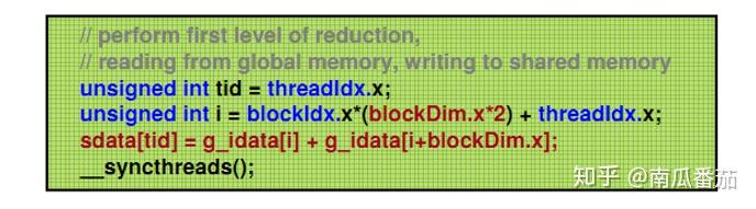 s初值是 blockDim.x 的一半,当(tid < s)再执行后面指令,那意味着在第一层iteration中就有一半线程是闲置的,这也太浪费了吧!怎么办?看到前面的给shared memory传值的语句: