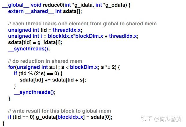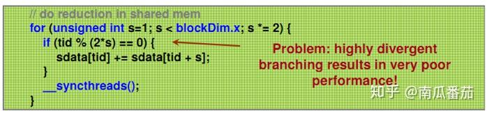 可以看到,每个block里reduce都在其shared memory里进行。如上面讨论过的,结果最终在每个block的0号线程里得到,并且存储在其shared memory sdata[0]里,而sdata[0]的值就是这个block输出的reduce的结果。逻辑上可行,但在实现上这里存在一个Warp Divergence问题。