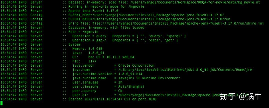 ./fuseki-server --file=kg_movie.nt --debug /kgmovie 其中,--file 指定RDF数据文件的位置,/kgmovie 则表示这个数据集上服务的路径。 顺利启动后会在终端会输出如下信息,可以看到 kg_movie.nt 中的数据被载入到内存中 ,这个服务器对这个数据集在 http://localhost:3030/kgmovie 上提供只读服务,可以通过query和sparql两个端点进行SPARQL查询,通过data和get两个端点读取数据。