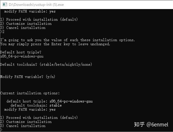 4、下载并运行 x86_64-pc-windows-gnu-rustup-init ,按提示完成安装即可。