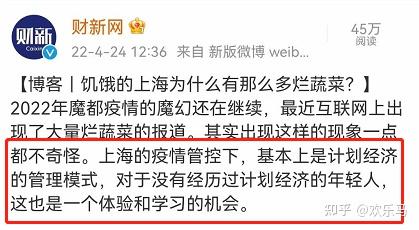 先把财新网清奇的节奏挂出来:“上海的疫情管控下,基本上是计划经济的管理模式,对于没有经历过计划经济的年轻人,这也是一个体验和学习的机会。”