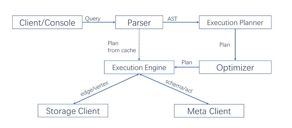 Query Engine 层的主要功能,是解析客户端发送 nGQL 文本,通过词法解析 Lexer 和语法解析 Parser 生成执行计划,并通过优化后将执行计划交由执行引擎,执行引擎通过 MetaService 获取图点和边的 schema,并通过存储引擎层获取点和边的数据。