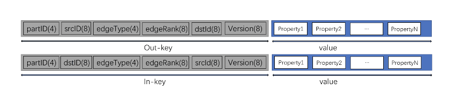 一条逻辑意义上的边,在 Nebula Graph 中将会被建模为两个独立的 key-value ,分别称为 out-key 和 in-key 。out-key 与这条边所对应的起点存储在同一个 partition 上,in-key 与这条边所对应的终点存储在同一个 partition 上。