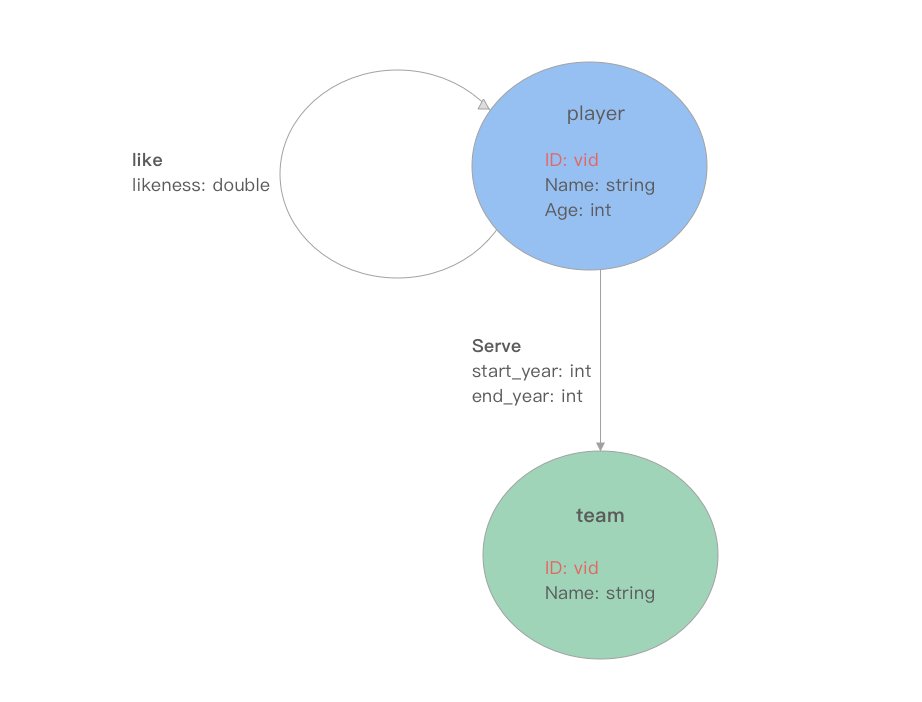 回到上面的图例,图中有两种类型的边,一种为 player 指向 player 的 like 关系,属性为 likeness (double);另一种为 player 指向 team 的 serve 关系,两个属性分别为 start_year (int) 和 end_year (int)。