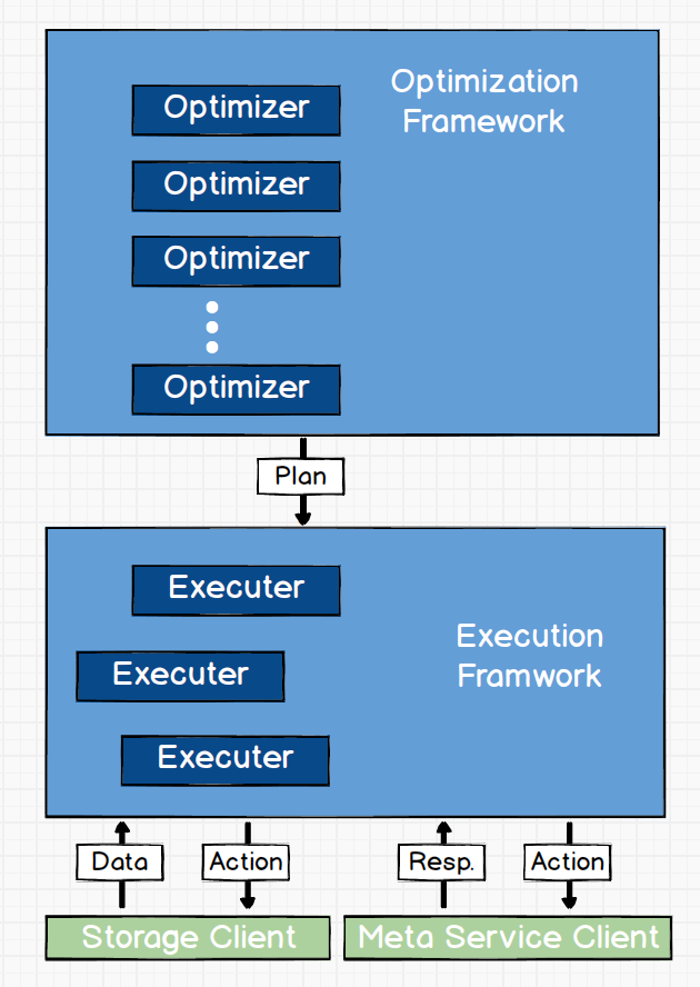 Query Engine 最后一步是去执行优化后的执行计划,这步是执行框架(Execution Framework)完成的。执行层的每个执行器一次只处理一个执行计划,计划中的 action 会挨个一一执行。执行器也会一些有针对性的局部优化,比如:决定是否并发执行。针对不同的 action所需数据和信息,执行器需要经由 meta service 与storage engine的客户端与他们通信。