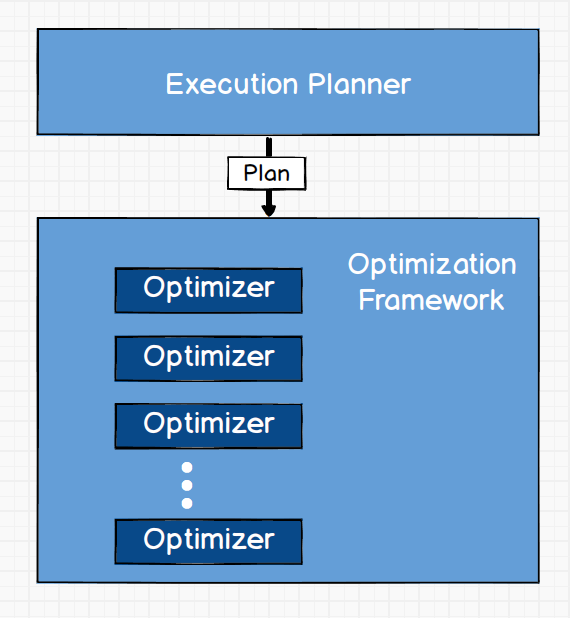 经由 Execution Planner 产生的执行计划会交给执行优化框架 Optimization,优化框架中注册有多个 Optimizer。Optimizer 会依次被调用对执行计划进行优化,这样每个 Optimizer都有机会修改(优化)执行计划。最后,优化过的执行计划可能和原始执行计划完全不一样,但是优化后的执行结果必须和原始执行计划的结果一样的。