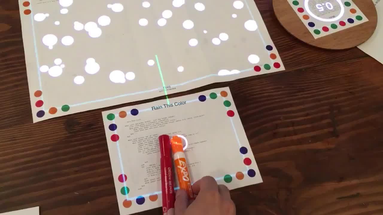 Dynamicland的推特上发布的许多“涂鸦”都是简单的、交互式的可视化效果,可以对房间里的其他物理对象做出反应。“这种颜色的雨”(Rain this color)产生连续的光流,其颜色由放置在特定区域的任何东西决定的。另一个演示展示了多个程序是如何交互:“计算下面的点”以“点圆”作为输入,大概可以识别其领域中的任何“点状”形状,也可以输出“点中的花”。